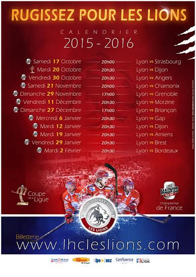 Nous avons aussi dégoté un partenariat avec le club de Hockey de Lyon. Nous vendons donc des places de Hockey à seulement 9 Euros au lieu de 15 Euros. Sur chaque ticket vendu, nous touchons 4 Euros. Vous trouverez le calendrier en photo.